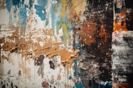 Colorful and textured layers of peeling paint create a striking visual display with warm tones blending into cooler shades.