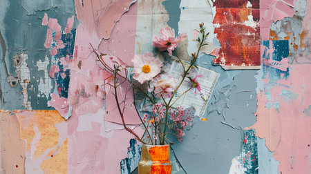 This painting contains abstract elements, metal elements, texture backgrounds, and flowers, plants, and flowers arranged in a vase.