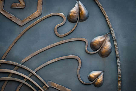 Details, structure and ornaments of forged iron gate. Floral decorative ornament, made from metal. Vintage metallic pattern. Decorative elements as a background.