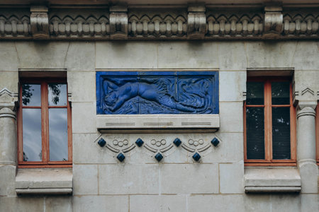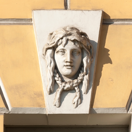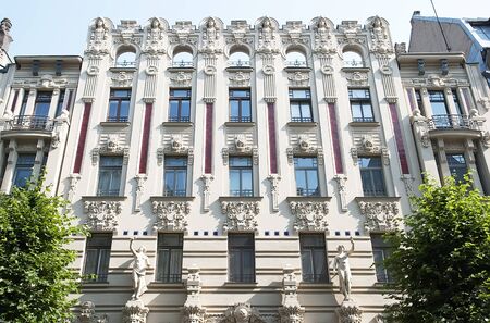 RIGA, LATVIA - JULY 11, 2017: Bas reliefs on facade of buildings in Art Nouveau style, located in historical Quiet Center on Elizabetes street.
