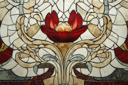 Closeup of flowers hand painted on vintage glass window backlit by sunlight
