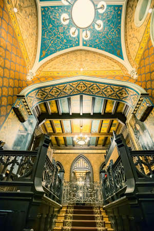 Rich entrance hall in the Lviv ancient casino with wooden staircases