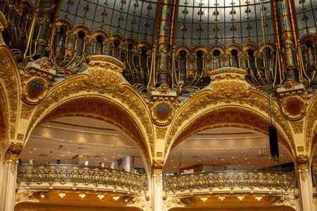 Paris, France - March 18, 2025: Galeries Lafayette interior in Paris. The architect Georges Chedanne designed the store with a Art Nouveau glass and steel dome