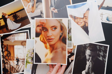 top view of the hands of a woman making a selection of a collection of pictures on a selection process of images on a desk after a photoshoot - focus on the center of the image
