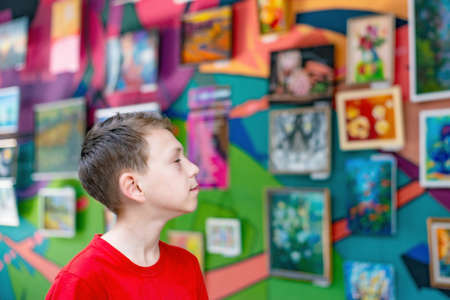 Young adult looking at paintings in an art gallery. The concept of education and interest in art.