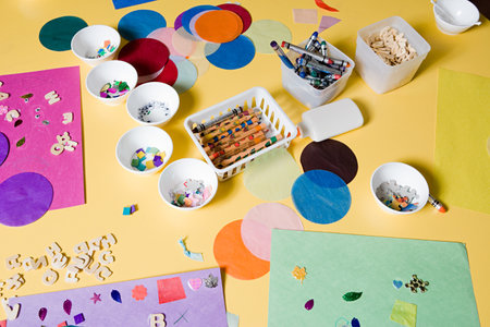Craft project making hands of woman and toddler kid together. Crafting with colorful glittering craft papers. Creating handmade gifts for Christmas or kids birthday