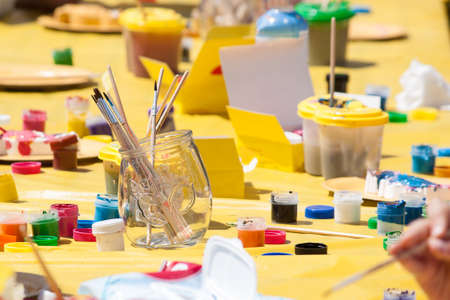 Various art supplies including brushes, paints, and sketchbooks are arranged on a bright, playful surface, ready for creative activities.