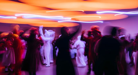 A long-exposure,motion-blur shot of a crowded party or nightclub. People are dancing,and their forms are blurred into abstract shapes and light streaks,with purple and orange lights dominating the energetic and chaotic scene.