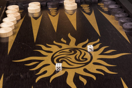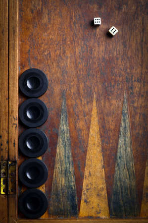 Backgammon table game, wooden board, dice and game chips closeup. Enjoying life, slow living. Leisure activities.