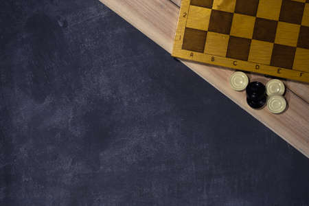 Sports or recreation Board game board with checkers. Hobby. Checkers on the playing field for the game.
