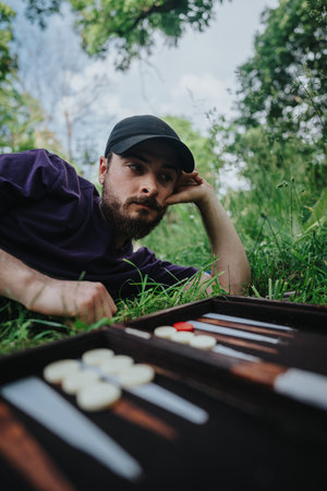 Multiracial friends enjoying a game of backgammon in the park on a sunny day, feeling happy and carefree
