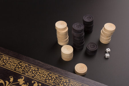 Board games wooden board of backgammon (tawla). Close-up details and checkers