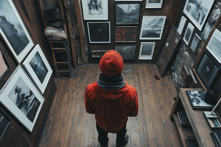 Man in a red jacket and beanie thoughtfully admiring black and white photography in a rustic gallery