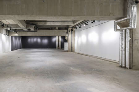 empty interior of large concrete room as warehouse or hangar with spotlights