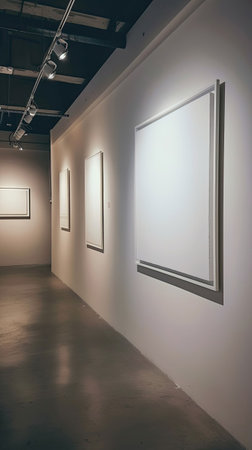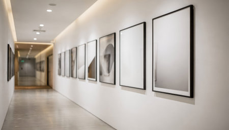 Contemporary corridor featuring minimalist framed artworks in sharp focus with outoffocus ambient lighting enhancing the modern aesthetic.
