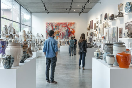 People admiring various ceramic art pieces in a contemporary gallery setting