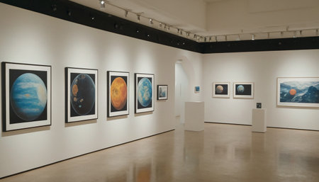 Interior of modern art gallery with pictures of planets, stars and galaxies