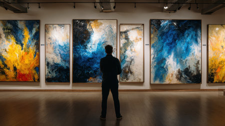 A person stands in front of large colorful abstract paintings absorbing the artistic beauty displayed.