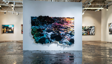 Vibrant abstract artwork displayed prominently in a contemporary art gallery setting, showcasing modern creative expression