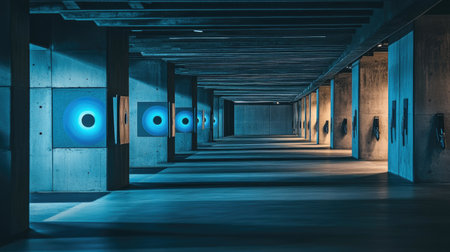 A modern art gallery featuring striking blue lighting and concrete walls. This architectural space highlights contemporary art with a tranquil ambiance and unique visual perspective.