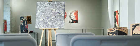 Banner of easel with creative artwork standing in the center of spacious gallery hall in front of several rows of white plastic chairs