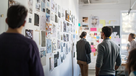 A creative meeting room where designers are brainstorming ideas, sketching on whiteboards, and looking at mood boards pinned on the walls.