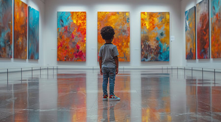 A young child stands in an art gallery, surrounded by large, colorful abstract paintings on the walls.