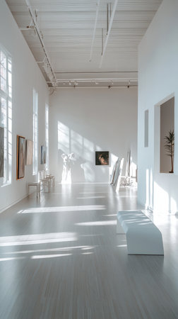 A serene art gallery interior featuring diverse artworks displayed on walls. The polished floor reflects the soft lighting, creating a tranquil atmosphere for art lovers.