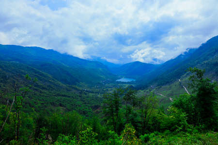 Mountains landscape with a lake view. Caucasus. Abkhazia. Shallow Lake Ritza