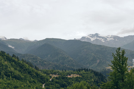 Typical Georgian mountains and villages. Lush green hills are dotted with traditional houses, rural landscape. Misty mountains in background add depth and sense of tranquility.