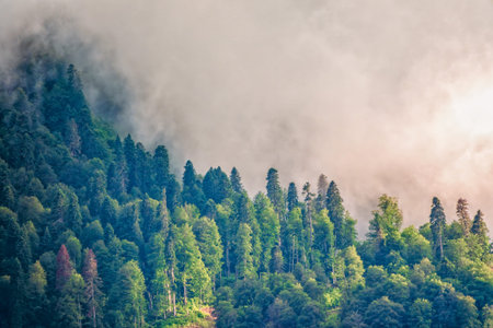 Beautiful foggy and cloudy mountain forest landscape.