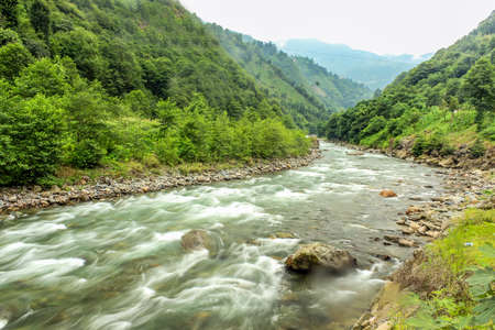 General landscape view of Firtina river in Rize Camlihemsin area flowing among big trees.