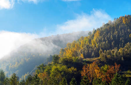 Mountain landscape in the autumn season. Beautiful natural yellow green orange paint nature. Lightly foggy day in the hills of the mountains.