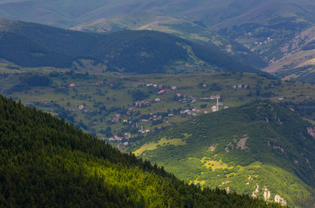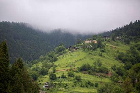 View of high plateau village, forest and mountain in fog creating beautiful nature scene. The image is captured in Trabzon/Rize area of Black Sea region located at northeast of Turkey.