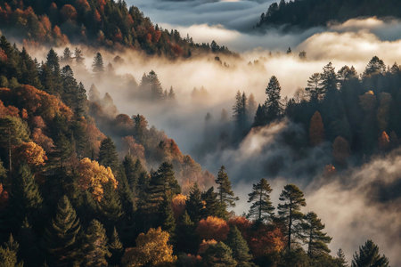 Autumn mist-shrouded mountain valley vista
