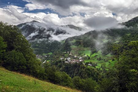 View of the village in the mountains in the fog. Georgia.