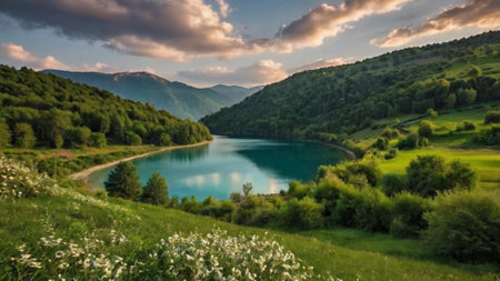 Panoramic View to the Blue Mountain Lake among the Green Forest Trees in the heart of Bosnia and Herzegovina