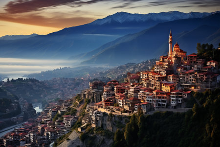 Panoramic view of Artvin city Turkey nestled between steep mountain slopes at sunset, with warm golden light illuminating the urban landscape and creating a serene atmosphere of harmony and beauty