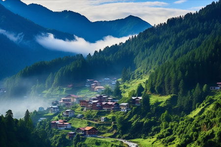 small, cloud-kissed mountain village at sunrise, created with generative ai