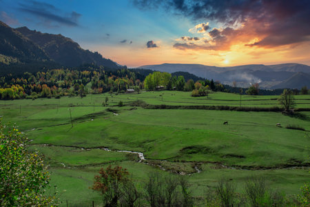 beautiful landscape of summer mountain valley in Georgia at sunset time