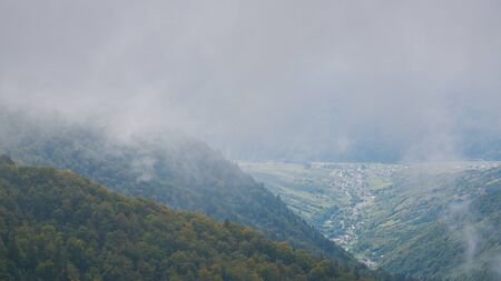 Mountain forest gorge landscape, clouds cling to the tops of high mountains, a glimpse of the suns rays