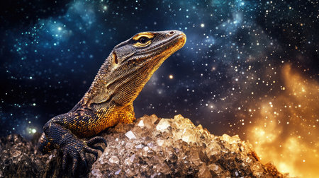 A stunning close-up of a lizard poised on a crystal surface, set against a breathtaking cosmic backdrop filled with stars and vibrant colors, evoking wonder.