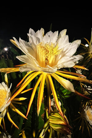 Dragon fruit. Vibrant Dragon Fruit on black background. Sliced white dragon fruit or pitaya on black plate on the table, close-up. Tropical and exotic fruits. Healthy and vitamin food concept.
