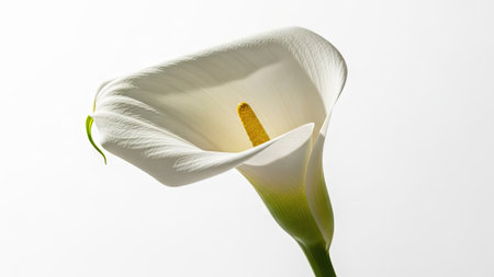 A single white Calla Lily with a long green stem on a clean white background. Clear details and vibrant colors...
