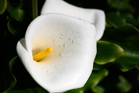 Beautiful calla lily flower with water drops on green leaves