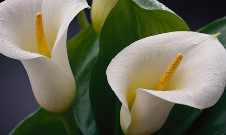Beautiful calla lilies with dew drops on dark background