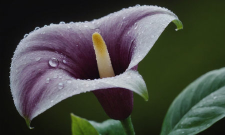 Beautiful purple calla lily flower with water droplets on dark background
