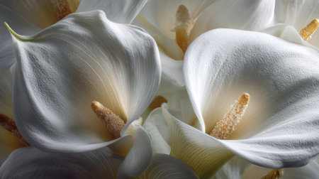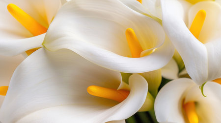 This image captures the delicate beauty of white calla lilies in a close-up view, showcasing their elegant petals and golden stamen. Perfect for floral decoration and design.
