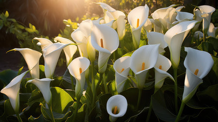 Sunlight filters through a garden of blooming calla lilies with highlights and shadows