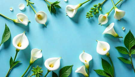 Elegant calla lilies arranged on a bright blue background